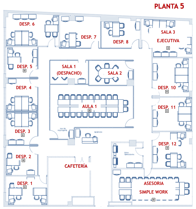 Contamos con 12 despachos de entre 13 y 23 m2 con capacidad para hasta 10 puestos de trabajo.